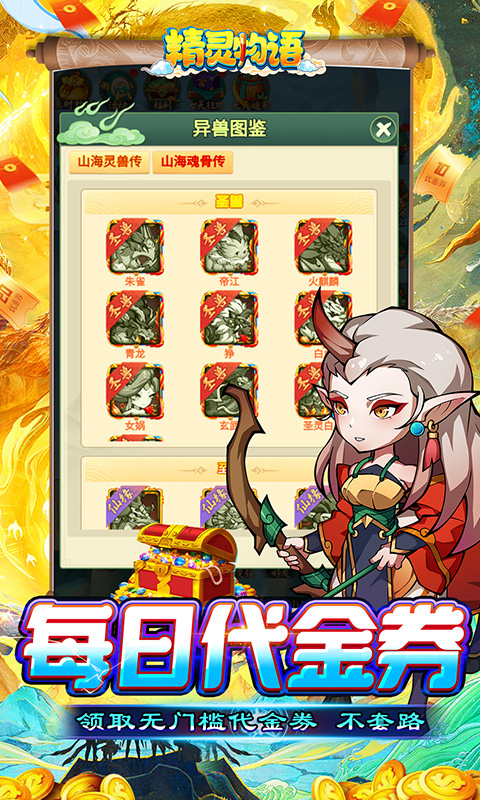 游戏介绍:这款山海经题材游戏,将带你进入一个充满策略与挑战的上古世界。构建一个庞大而丰富的世界观,众多耳熟能详的神兽登场,为你带来全新的游戏体验。 在这里,你不仅要收集、培养各种强大的神兽,还要合理搭配阵容,制定出最适合的战斗策略。每个神兽都拥有独特的技能和属性,如何发挥他们的最大优势,是你在游戏中需要不断思考和探索的问题。同时,游戏中还有丰富的副本、竞技场等玩法,考验你的策略和实力。快运用你的智慧,组建属于自己的最强战队!