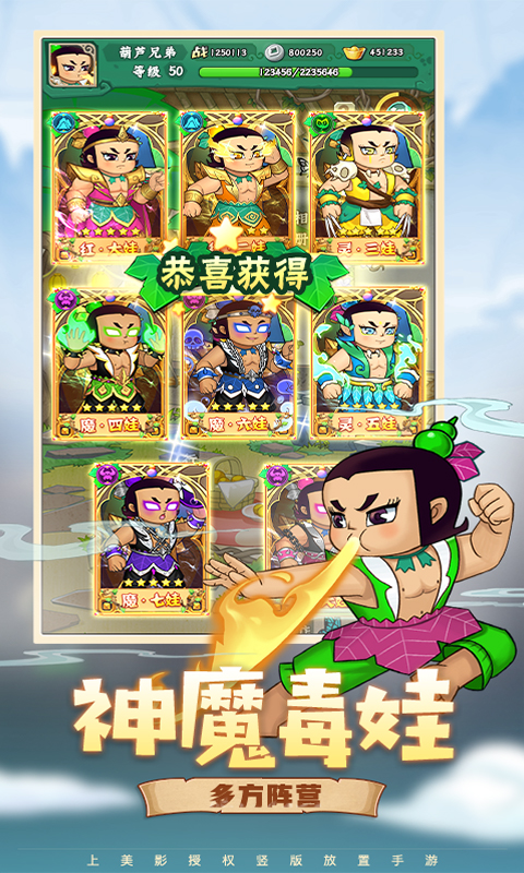 游戏介绍:由上海美术电影制片厂正版授权,以86年剪纸风《葫芦兄弟》动画片为原型的手游大制,深度还原动漫情节。游戏内含全新特色玩法-葫芦直充,可通过游戏进度获取钱包余额,可在游戏内实现免费提现,激活累计充值活动的超强体验功能。可轻松练级,休闲挂机,忙时经验不错过,上线挑战奖励多丰富,您可以和葫芦七兄弟共闯妖巢!带领葫芦兄弟披荆斩棘,洞破妖洞大门!保住穿山甲,救出爷爷,就在《葫芦兄弟-七子降妖》!