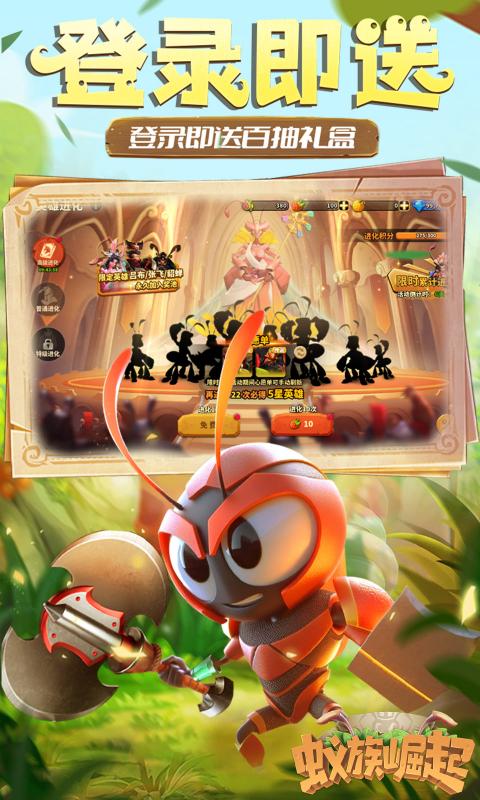 游戏介绍:造蚂蚁王国,与何止百万玩家斗智斗勇,招蚁族豪将,丰富阵营赢下战争!在《蚁族崛起》你将作为蚁族统帅,建造你的专属蚂蚁王国。神机妙算的三国英雄、智勇双全的凯撒,还有数位出类拔萃的豪将,都等待你招募入队,成为蚁族中坚!通过资源囤积、城防修建、战力提升,将一方蚁穴壮大成为兵「蚁」强壮的王国城邦!与百万玩家结盟或是为敌,抵御强敌进攻,联手攻克城池,战无不胜,攻无不取,成为地下世界的霸主!与此同时,游戏还采用技术前沿的引擎开发,呈现高品质的画面。画面还原蚂蚁与战争细节,玩家可以尽情感受微观世界的对决乐趣,在神奇的蚂蚁世界中招兵征战。